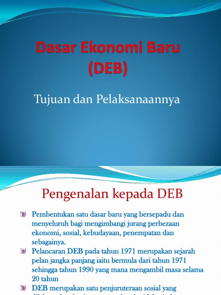 Deb dilaksanakan atau diperkenalkan pada oleh deb dilaksanakan antara tempoh 1971 hingga 1990. Dasar ekonomi baru (deb) merupakan satu program sosioekonomi di malaysia yang diperkenalkan pada tahun 1971 oleh perdana menteri tun abdul razak dato' hussein. Matlamat tersurat deb adalah untuk mencapai perpaduan negara dan integrasi nasional dan ia telah digubal. Matlamat tersurat deb adalah untuk mencapai perpaduan negara dan integrasi nasional dan ia telah digubal dalam konteks strategi. Dasar ekonomi baru merupakan satu bentuk perancangan yang dilancarkan oleh kerajaan dalam tahun 1970 melalui rancangan malaysia kedua.
